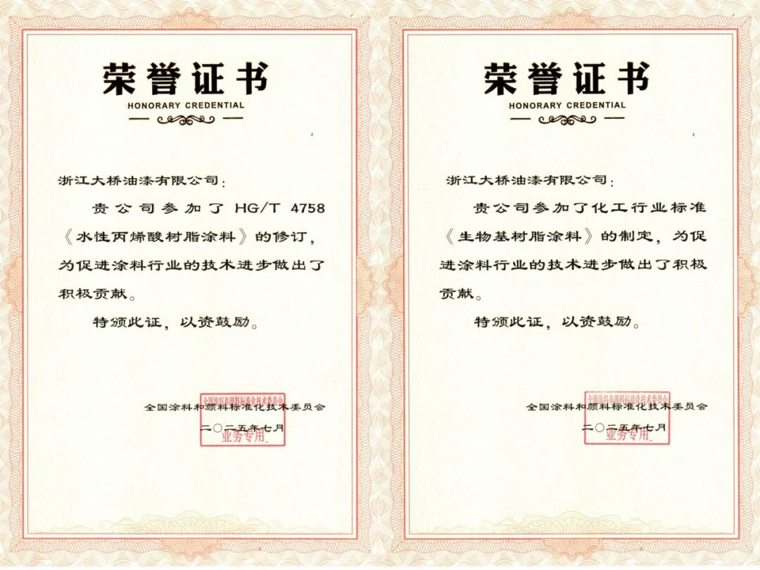 多年來,青青草免费在线油漆參與了18項國家標準和行業標準的起草製定和修訂工作。今年,青青草免费在线油漆參與了化工行業標準《生物基樹脂塗料》的製定與HG/T4758《水性丙烯酸樹脂塗料》的修訂工作。這兩項標準直指綠色環保與生物基新材料的前沿領域。
